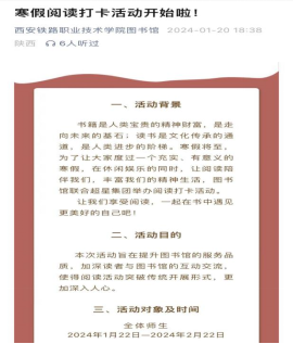 为进一步提升图书馆的服务质量,鼓励师生利用假期时间坚持阅读,激发读书热情,享受阅读乐趣,营造爱读书、读好书、善读书的氛围,1月22日至2月22日,图书馆举办了寒假阅读打卡活动。